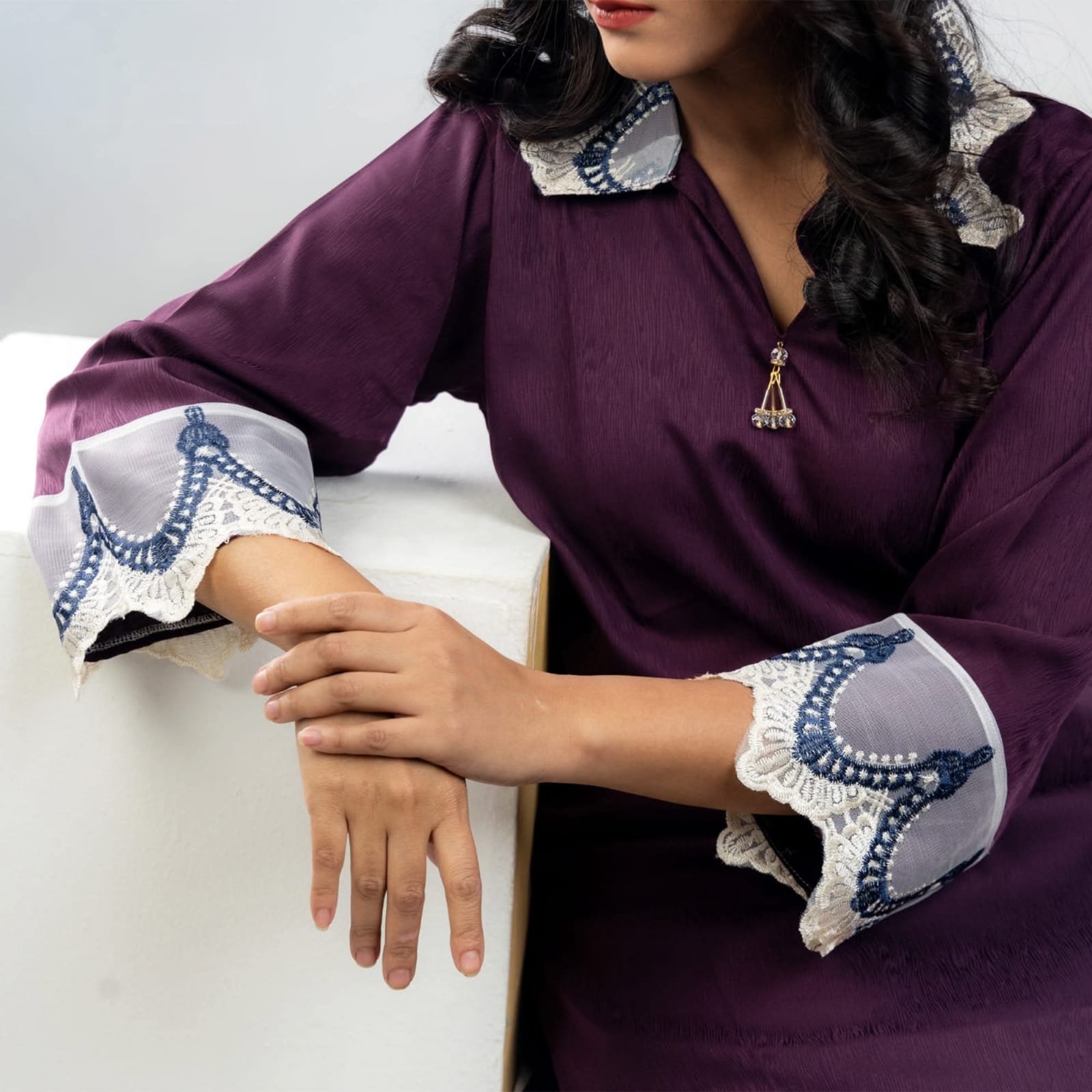 - Fully embroidered shirt with lace/loop detail on the neckline